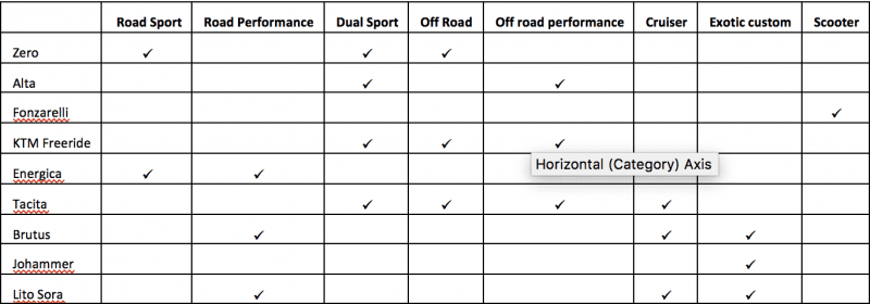 I have also left out a few notable names, such as Lightning motorcycles (because their volumes are less than 25 units), and Brammo (because they are no longer sold despite being relatively successful up until ceasing production).