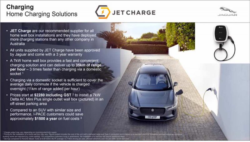 Jaguar offers a $2,280 home-charging unit via JetCharge that delivers a 7kW home box that will top up 35km of range per hour. That is three times faster than a domestic socket.