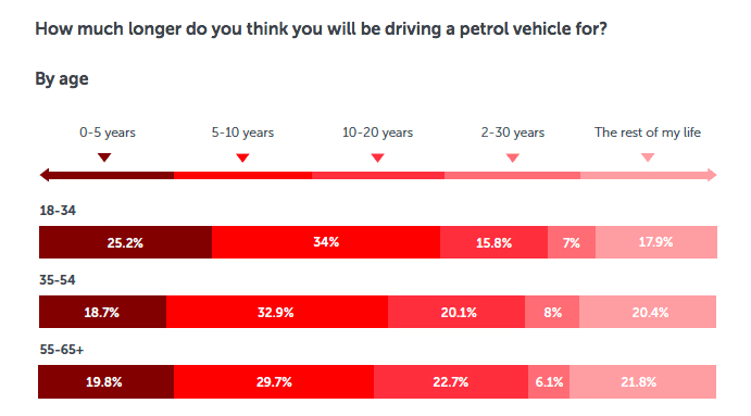 It found that more than half of the respondents said they did not think they would be driving a fossil fuel car, either petrol or diesel, within 10 years. More than 21 per cent said they would be going electric within five years.