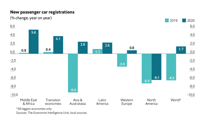 The EIU predicts a 1.7 per cent rise in global car sales in 2020, with the biggest boost coming from electric vehicles, which it expects to jump to 2.8 million from 2.2 million (a rise of 30 per cent), driven by initiatives such as the new Tesla gigafactory in China, and the response of Chinese manufacturers.