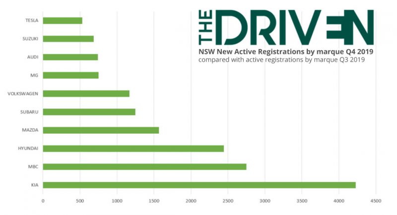 New figures reveal Tesla made it into the top 10 most popular auto brands registered in NSW in the last quarter of 2019, while some American and Japanese mainstays suffered dipping sales that placed them at the bottom of the list.