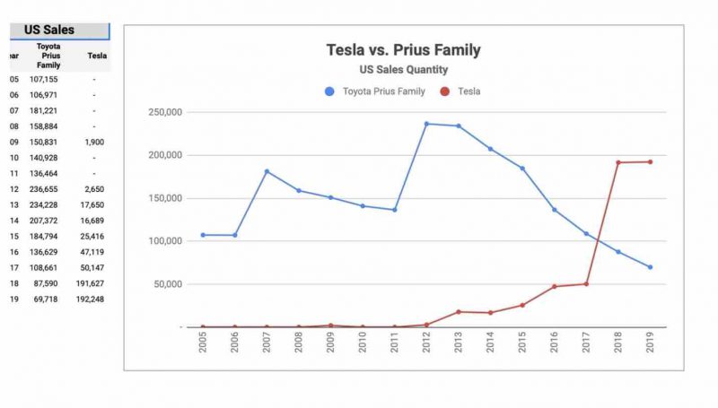 It’s the story of sales of the Toyota Prius and Tesla EVs in the US. It is significant because it tells of two different strategies – one firmly on the future with no concern about legacy assets, and other with an eye to the past and a determination not to rock the boat, or its business model; and another strategy with the focus firmly on the future, and no legacy distractions.