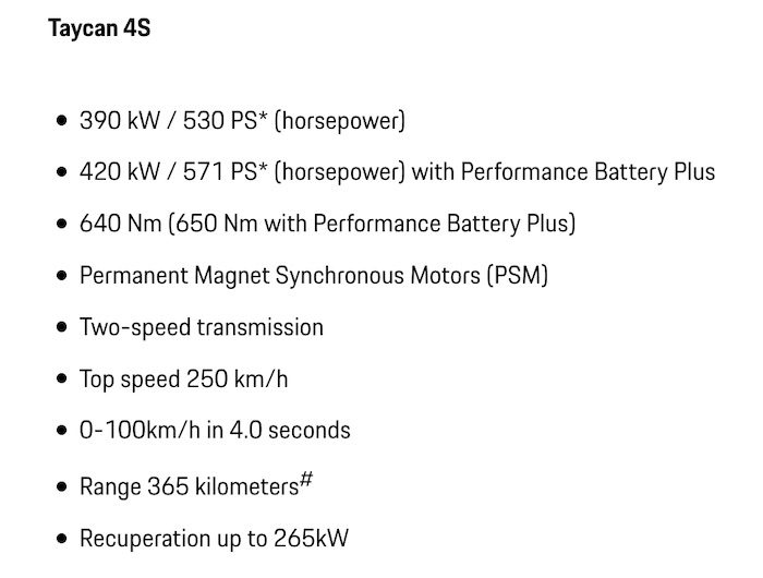 On range, the Taycan 4S offers a base of 365km, or 414km with the addition of Porsche’s Performance Battery Plus, which also boosts that model’s battery capacity by 18% from 79.2kWh to 93.4kWh, and its “performance” to 420kW of power and 650 Nm of torque.