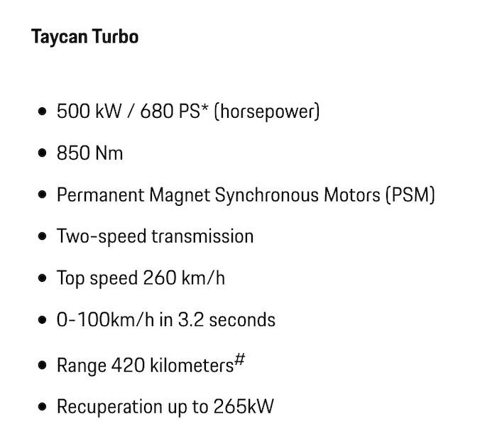 The Taycan Turbo has a range of 420km, and generates up to 500kW/680 PS* (horsepower) of overboost power in combination with Launch Control, and offers a top speed of 260km/h.