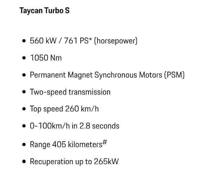 The “flagship” Turbo S has a range of up to 405km when the battery is fully charged and can generate up to 560kW/ 761PS* (horsepower) of overboost power in combination with Launch Control.