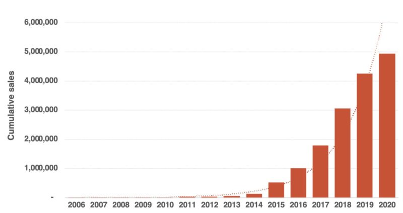 These were 1.75% of the country’s total vehicle stock. Ten years ago, China had only deployed some 20,000 NEVs nationwide, and it was only eight years ago that China established a mid-term strategy for NEV development that aimed at a cumulative 5 million vehicles sold by the end of 2020.