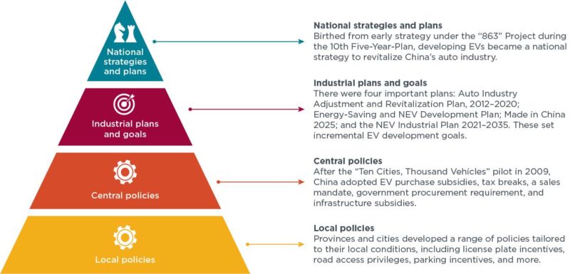 - Clear national strategies and plans: China’s Five-Year Plans are now world-famous for setting a top-down agenda for economic development and coordinated national ministry action, and these have been the backbone of strategy and policy continuity in China’s NEV development. The industrial plans contained within the Five-Year Plans set detailed development goals and targets for NEVs, including market size and technology penetration rates, and identified the policies and funding required to meet those goals. Policies like the “Ten Cities, Thousand Vehicles” pilot projects, as well as subsidy programs, tax breaks, and technical standards, all grew from these macro-level plans.