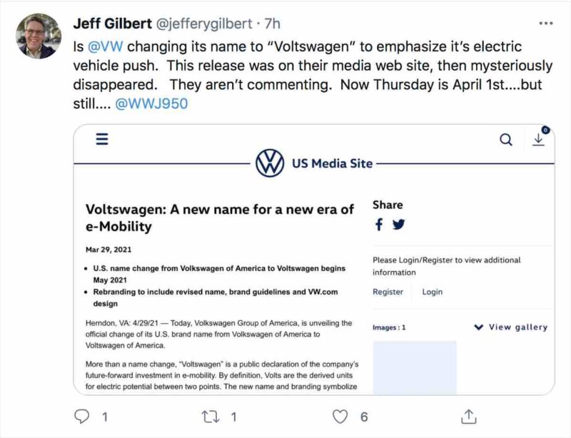 “We might be changing out our K for a T, but what we aren’t changing is this brand’s commitment to making best-in-class vehicles for drivers and people everywhere,” said Scott Keogh, president and CEO of the newly-named Voltwagen of America, in a quote provided in the now vanished press release.