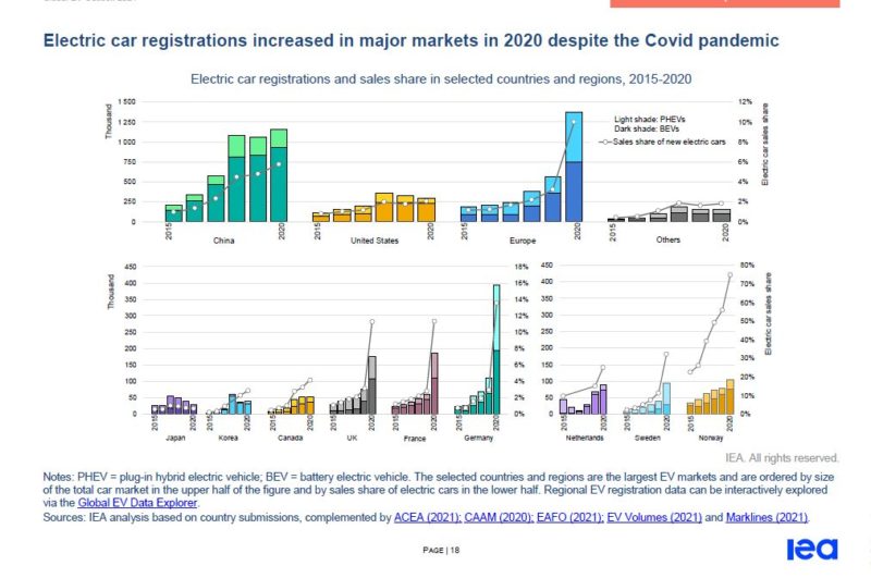 2020 ended up with a total of more than 10 million electric vehicles on the world’s roads, and another 1 million electric vans, trucks and buses. The market has shifted to Europe from China, with 1.9 million registrations compared to China’s 1.2 million. The US remains the other significant region for electric vehicle sales.