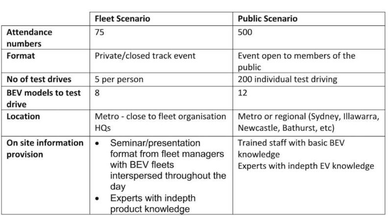 The below table from the documents outlines possible scenarios for both fleet and general public test drives, including the number of EV models that should be made available, the number of test drives made available and possible locations for the events.