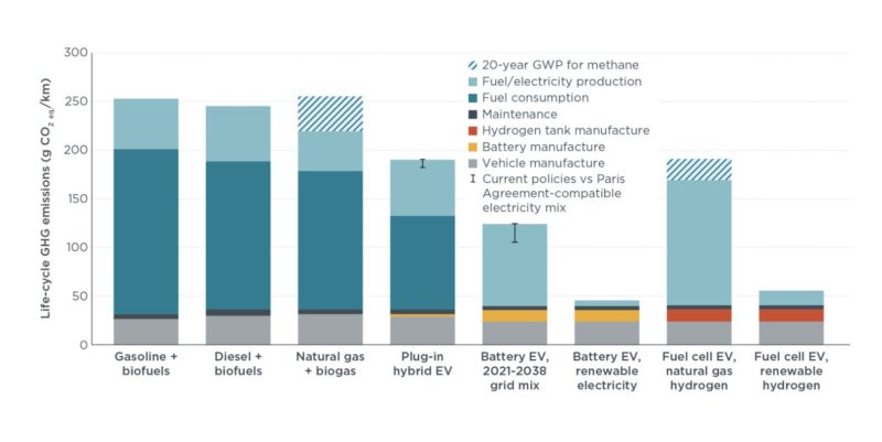 . Importantly, our assumptions of vehicle emissions/efficiency factors are based on real-world measurements and data collection. We included the GHG emissions from vehicle manufacture and recycling, battery manufacture, hydrogen tank manufacture, fuel/electricity production, fuel consumption, and vehicle maintenance.