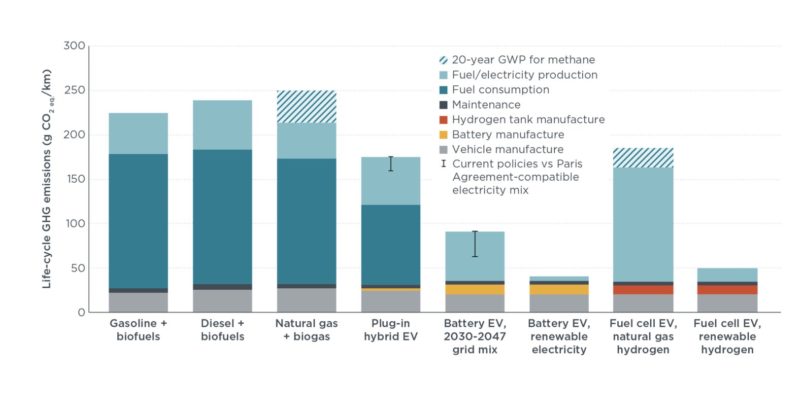 As shown in Figure 2, global typical battery electric vehicles projected to be registered in 2030 will only emit, on a life-cycle basis, 63–91 g CO2 eq./km. Once the grid is fully renewable, that number goes down to 41 g CO2 eq../km, and we see similar numbers for fuel cell vehicles fueled with renewable hydrogen.