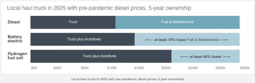 Based on this quick calculation, the fuel and maintenance costs of battery electric trucks must be just 15% lower to break-even with diesel. For hydrogen fuel cell trucks, fuel and maintenance must come in 45% lower than the cost of diesel.