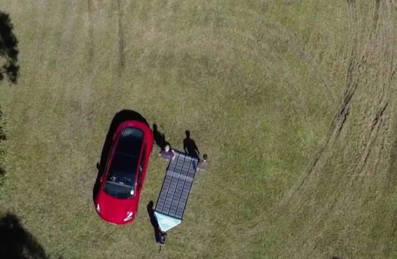 Print out long sheets of flexible solar panels, roll them up, throw them in the boot of a Tesla and drive for 84 days and 15,097km around the entire coastline of Australia, unrolling the solar sheets along the way to use for off-grid charging.