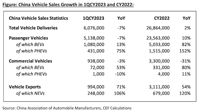 China EVs reached a 29% market share of passenger vehicle sales in 1QCY2023, according to the China Association of Automobile Manufacturers (CAAM). EV sales grew 26% year-on-year (yoy) to over 1.58 million, with fossil-fuel vehicle sales falling 15% over the same period.