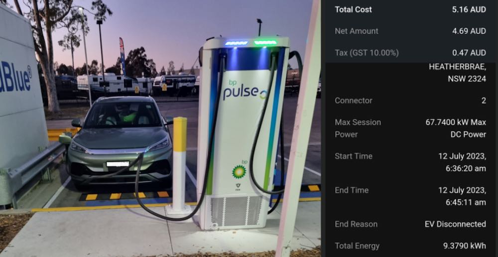 - Chargers need to be monitored. Unfortunately it seems you can’t just set your car to charge and wander off. Unlike the home fast chargers, the public chargers will at times trip off or require a restart for one reason or another – particularly the free NRMA chargers. You should be able to monitor the live charging status of your car with the vehicle’s app (BYD app in my case) so you can head back to the car and reset the charger if required.