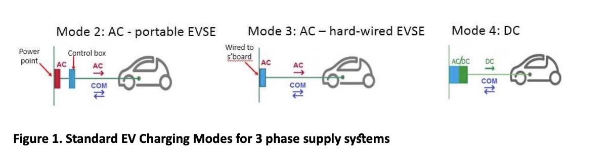 In countries that use three phase electricity supply systems, there are three options for EV charging – these are referred to as Modes 2, 3 and 4, as shown in Figure 1 below.