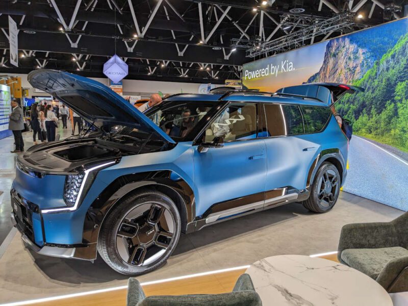 Kia was showing off the vehicle to load (V2L) capabilities of their e-GMP vehicles at the expo by powering their entire stand from an EV9 and EV6 GT. Hu explained the V2L adapters come included with top trims but can be purchased as an accessory through Kia and will work with lower spec trims.