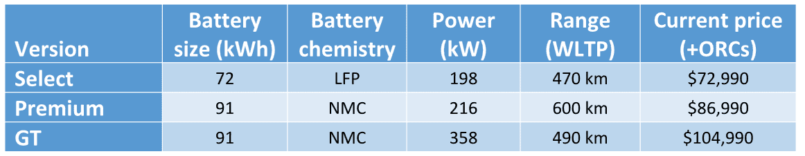 Offered here in three versions – the Select version I drove for the week is the ‘base’ version with a 72 kWh LFP chemistry battery and a 198kW motor supplying the rear wheels. Next up is the Premium with a 91 kWh NMC chemistry battery. The Premium is also rear wheel drive (RWD) but motor power has been upped by 18 kW to 216 kW.
