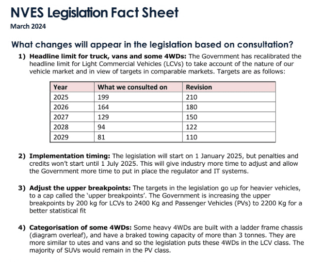 Light commercial vehicles, mostly utes, also benefit from a higher headline limit of 210 grams of CO2 per km in 2025 (up from 199 saving $1,100 in fines per vehicle), and 110 g/km in 2029, instead of the originally proposed 81 g/km.