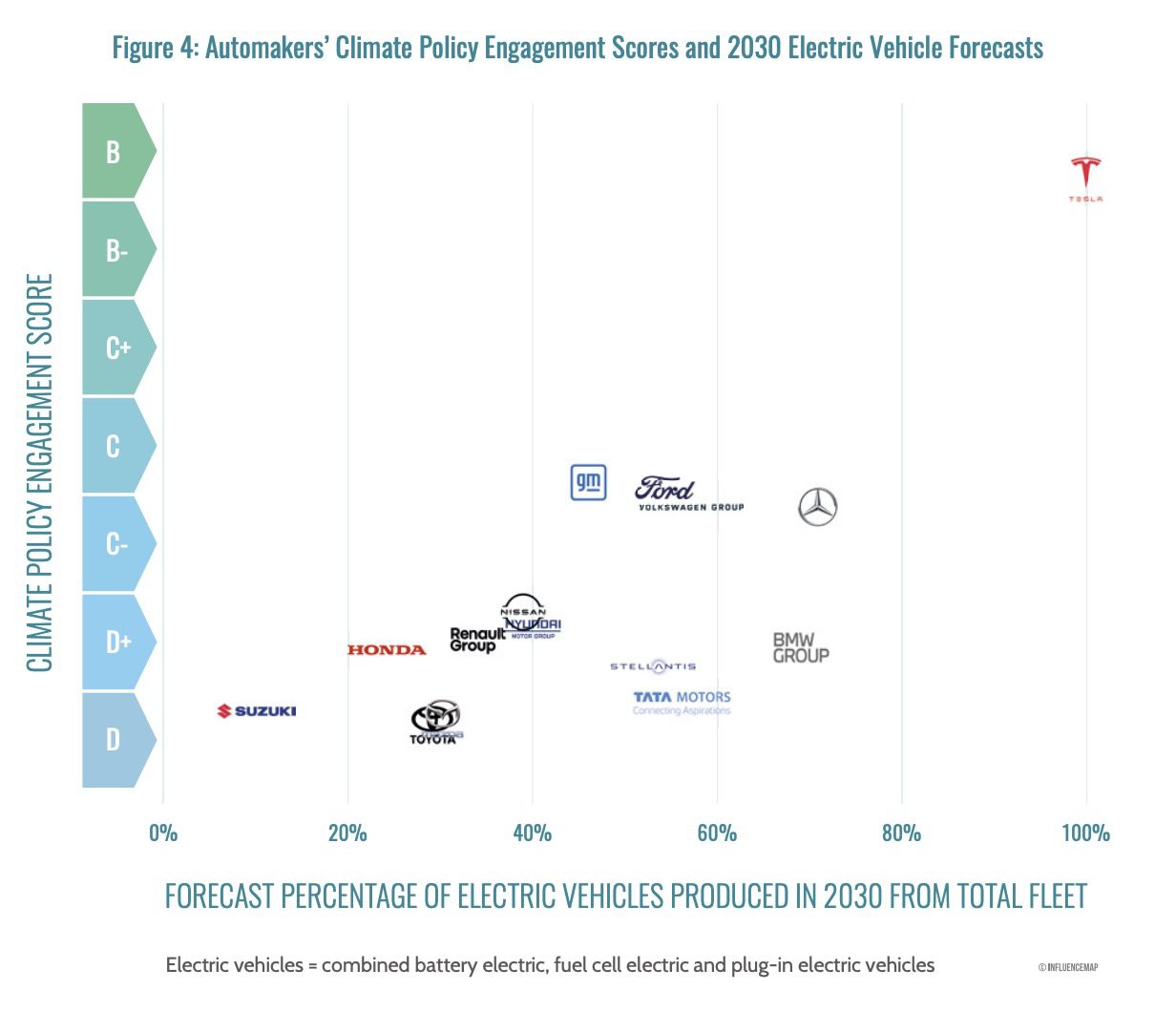 “Toyota, with a Performance Band score of D, remains the lowest-scoring company and is found to be driving opposition to climate rules in multiple regions.” says the report.
