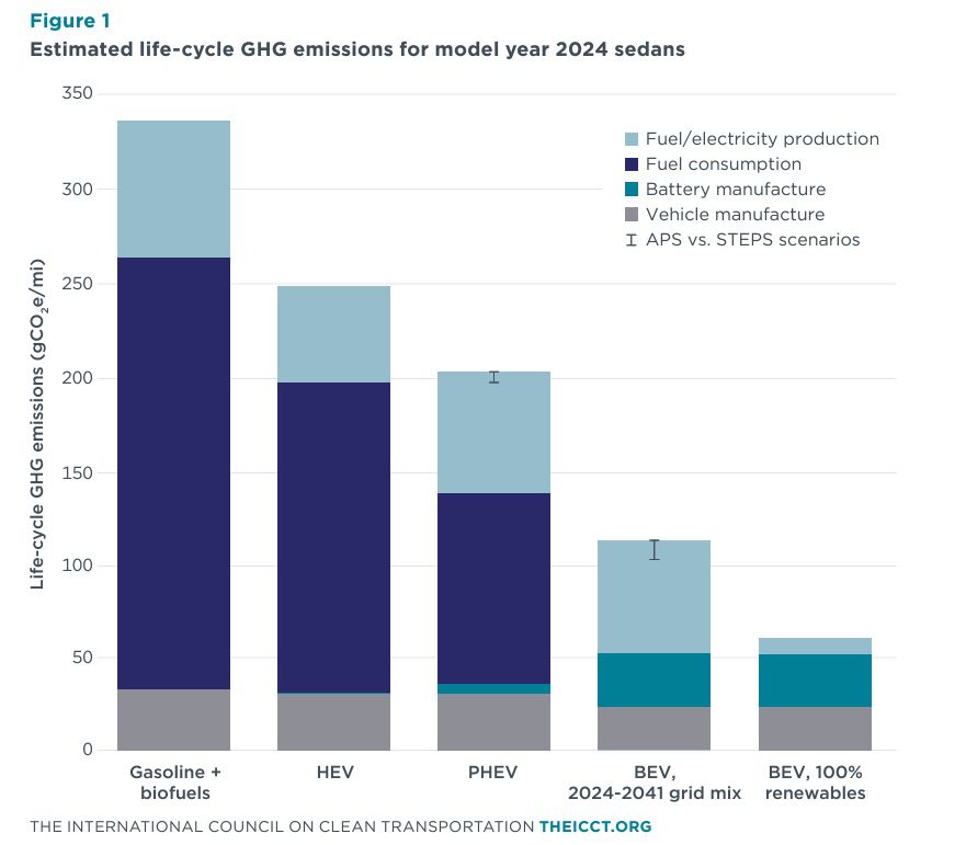 And while PHEVs and HEVs will have a lower GHG footprint than ICE vehicles, the ICCT concludes that “their emissions reduction potential is more limited than for BEVs, which not only deliver emissions reduction at the tailpipe, but across the entire vehicle lifetime for representative sedans and SUVs sold in the United States.”