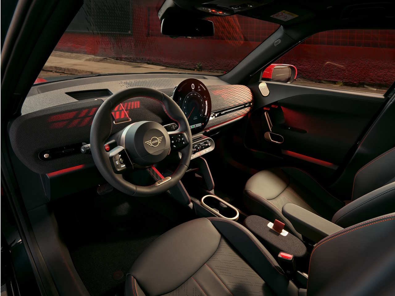 A number of design cues reflect the John Cooper Works branding outside and inside, featuring red, white, and black JCW logo and colouring, while daytime running lights feature horizontal bars in JCW Signature.