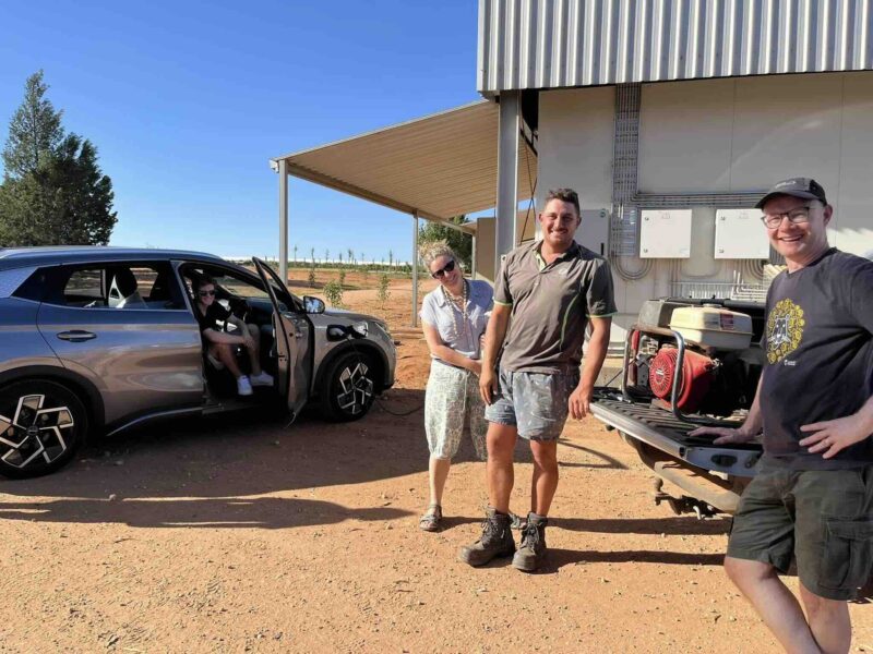 Rather than wait for a couple of hours at 10 Amps on a noisy, polluting, petrol genset for enough charge to complete our journey, we switched to 7 kW charging. It turned out Daniel – a commercial table grape grower – had 100 kW of solar on the roof of his shed, so his power was free and zero emissions.