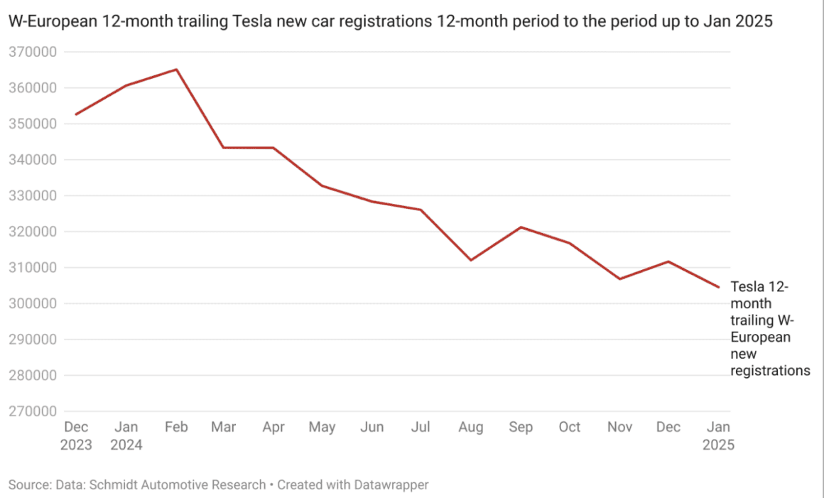 Schmidt noted that Tesla’s market share in Europe had been in “free-fall” through the 2024 calendar year, even before Musk openly declared support for Germany’s far right AfD party and said this has “added an element of toxic contagion throughout the market.”