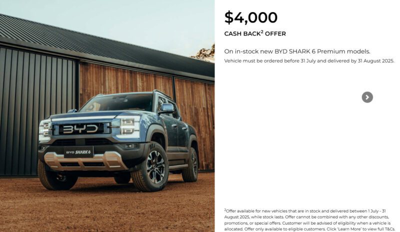 Chinese car maker BYD has offered a surprise $4,000 cash-back offer for its best selling car in Australia, the Shark 6 plug in electric ute.