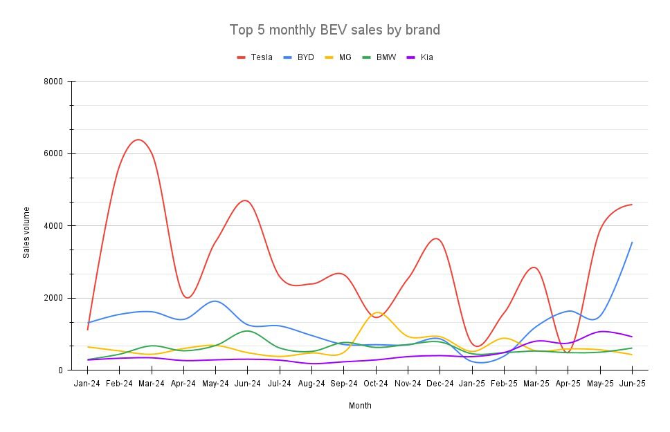 Using data collected for The Driven by contributor Tim Eden – which you can find in our month by month sales data, we have plotted the progress of the top five EV brands in the Australian market – Tesla, BYD, Kia, BMW, and MG.
