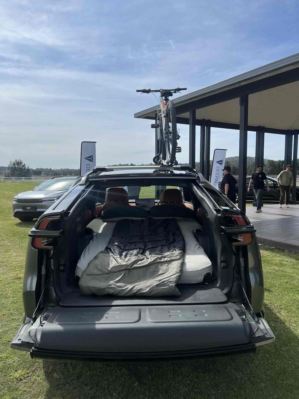 Approach the rear of the vehicle and say “Hey Deepal open the boot” (or push a button if you’re old fashioned) and the E07 stops pretending to be an SUV, beginning its signature transformation. The glass retracts, tailgate folds flat, the seats vanish, and you’re now looking at an open tray that Deepal claims can fit a queen size mattress.