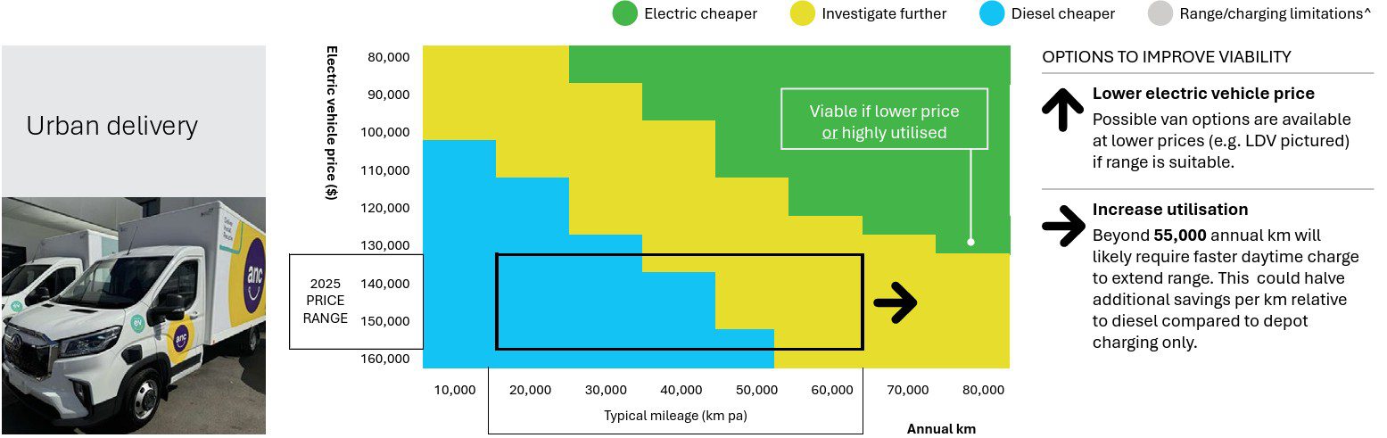 The graph below compares electric vehicle price versus typical annual mileage to reveal the cost competitiveness of electric trucks against diesel.