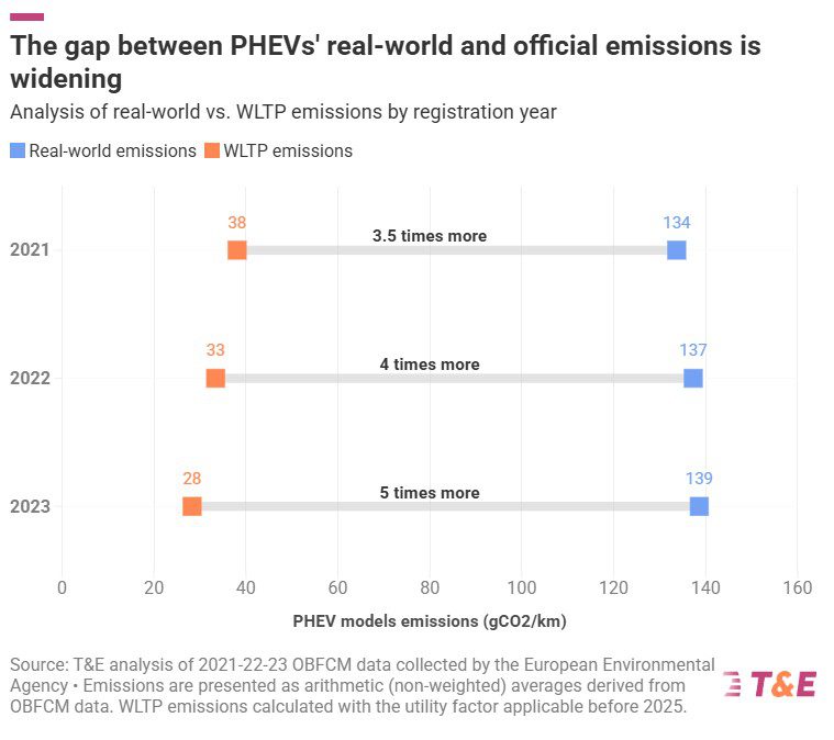 At the time, Fraunhofer ISI warned that “real-world fuel consumption of PHEVs in Europe is on average three to five times higher than WLTP type-approval values.”