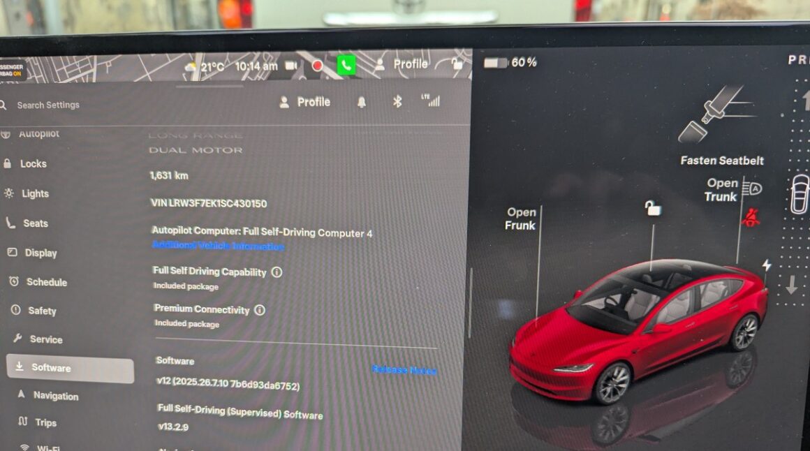 Inside, once again, the car is just the standard car with an upgraded white seat option. Looking at the screen, the FSD Supervised version we had was version 13.2.9.Ā