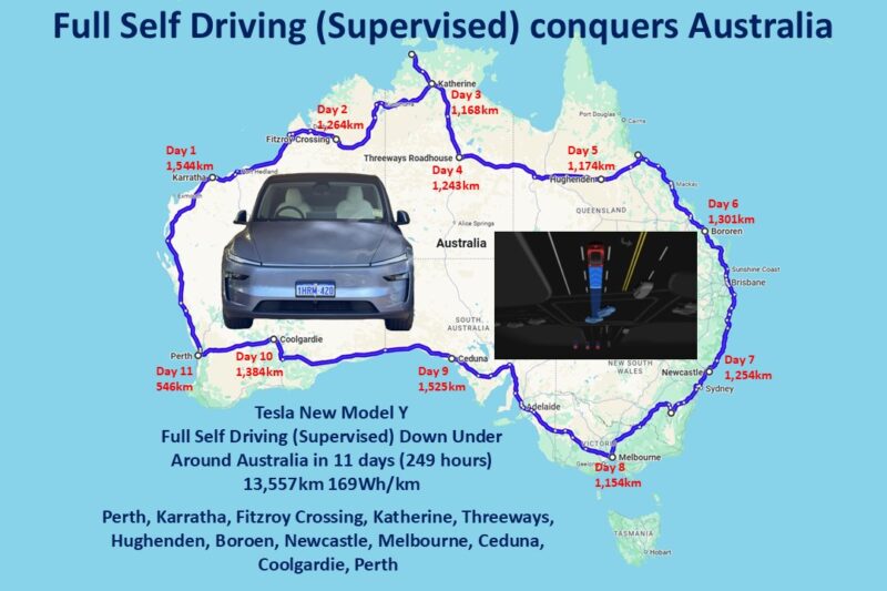 A world first has taken place in Australia with a Tesla Model Y circumnavigating the country using the company’s recently launched full-self-driving (FSD) Supervised.
