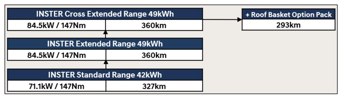 The Inster extended range has a 49 kWh battery (and range of 360 kms), while the “cross” version also has a 49 kWh battery and a similar range, although watch out if you get this with the roof basket – it will cut the range by more than 15 per cent. That is not an aerodynamic basket.