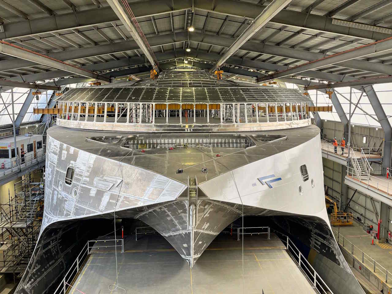 The Hull 096 ferry is being built for South American ferry operator Buquebus and was originally intended to be an LNG-powered vessel, until COVID19 shutdowns gave Incat time to tinker and come up with a more innovative proposal.