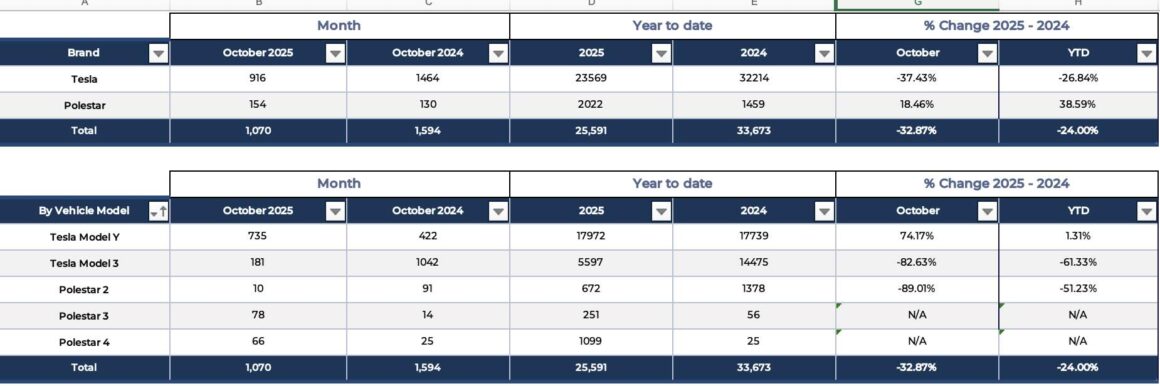 Sales of Australia’s leading EV brand Tesla have slumped in October – following a typically buoyant end-of-quarter result in September – with the Model 3 electric sedan hitting its lowest levels since 2022, and despite a stronger performance from the Model Y electric SUV.