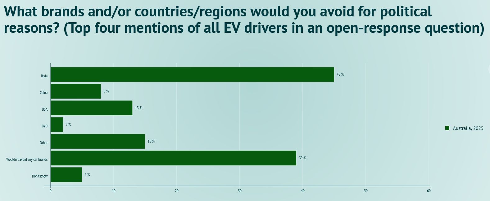 For Denmark, it was 71%, but in Brazil it was only 16%. Interestingly, for Denmark it was 31% avoiding Tesla and 37% avoiding Chinese brands … whilst in Australia EV drivers were next less likely to buy a US made car (13%) than a Chinese made one (8%).
