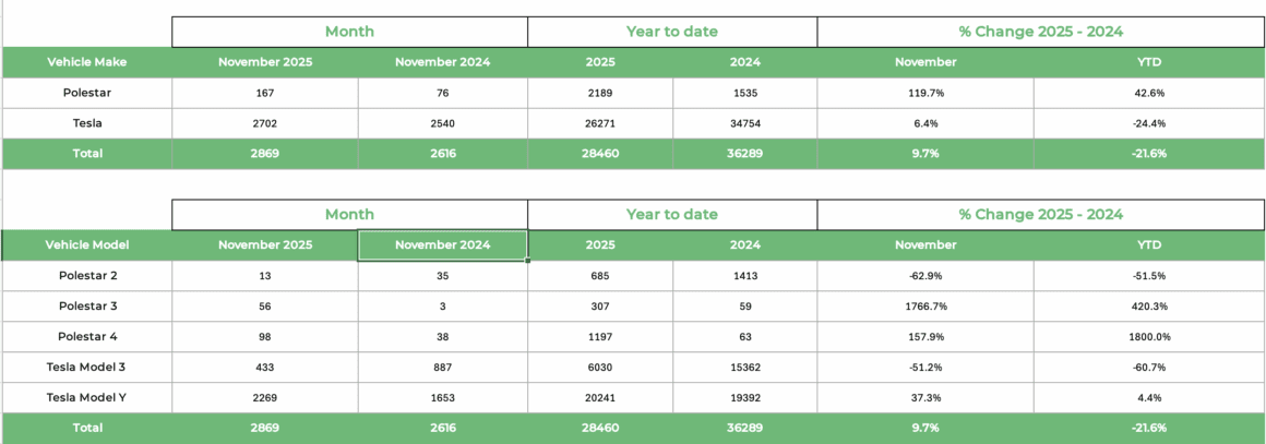 The first data on EV sales in November shows a promising rise, with EV specialists Tesla and Polestar showing a combined Ā 2,869 EV sales in the latest month, led by the Tesla Model Y with the Model 3 still struggling.