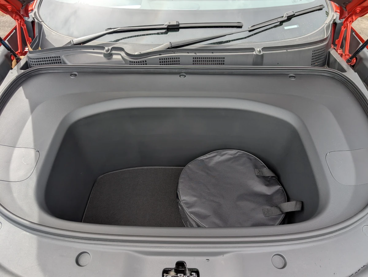 Underneath the bonnet is a usefully sized 125 L frunk, opened by pulling twice on a lever beneath the steering wheel. Mine was fitted with a piece of carpet at the bottom, but this can be easily removed if you want to throw in wet or dirty gear.