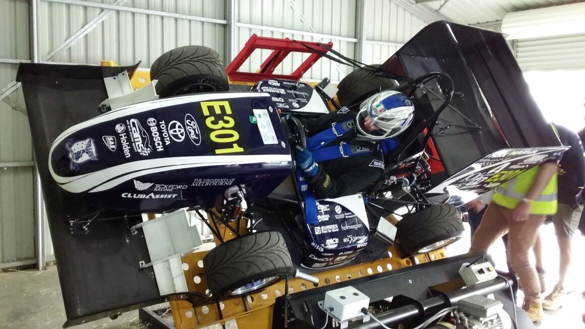 Melbourne University Racing Team EV undergoing ‘tilt’ test scrutineering step. Image: B Gaton.