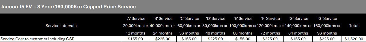 Speaking of capped price servicing, the Jaecoo J5 EV 8-year service plan will set owners back $1,520 over 8 years of ownership, if driving less than 20,000 km/year. That’s great value compared to some other EV servicing plans we’ve previously come across.