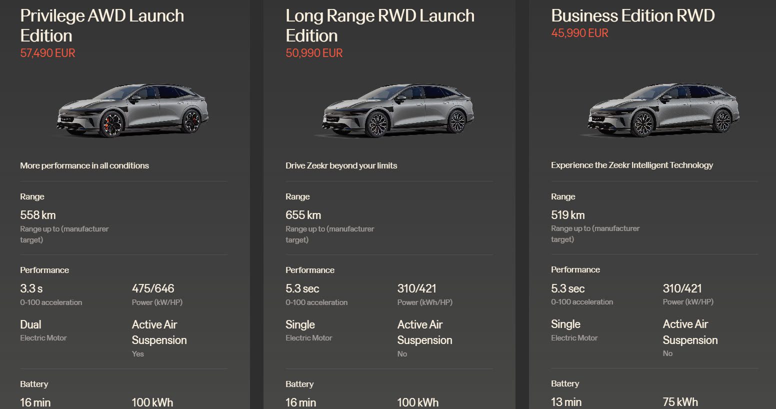 The base Business Edition RWD model, which has a Zeekr-engineered 75 kWh battery pack, delivers up to 519 km of WLTP range.