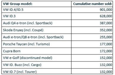 The following list gives an overview of the 10 most popular BEVs from the Volkswagen Group (to the nearest thousand), which together accounted for more than 80 per cent of deliveries to date: