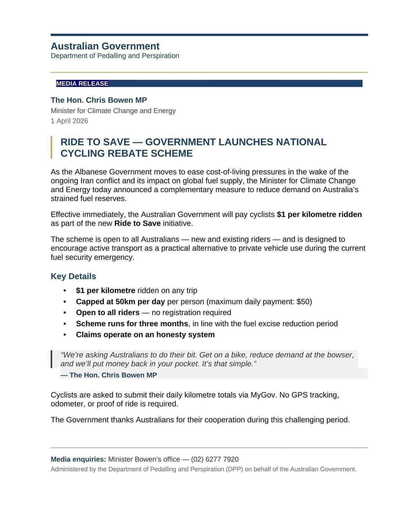 It was April 1 and there were some ‘funny’ things going around. One is a “press release” from the Department of Pedalling and Perspiration.